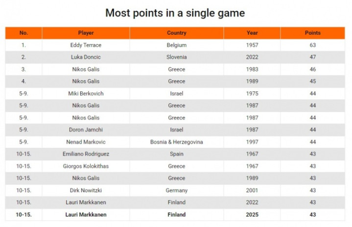 马尔卡宁43分并列欧锦赛单场得分榜第10 东契奇47分第2特雷斯63分